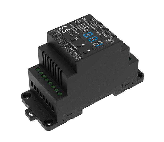 Dekoder D4(B) służy do sterowania wielokolorowym oświetleniem LED za pomocą protokołu DMX512.