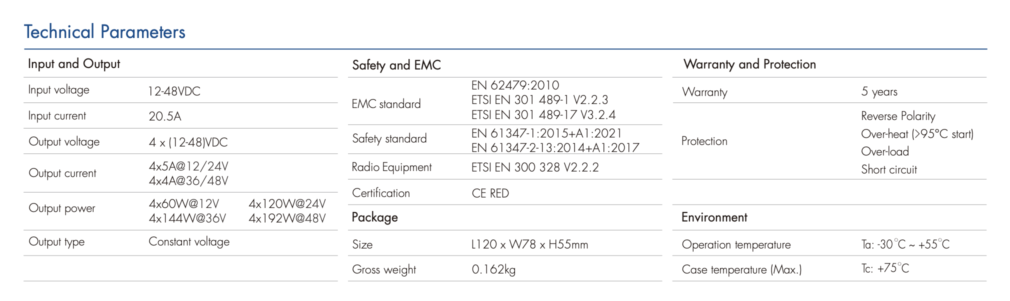 - Napięcie wyjściowe: 4 x (12-24)VDC