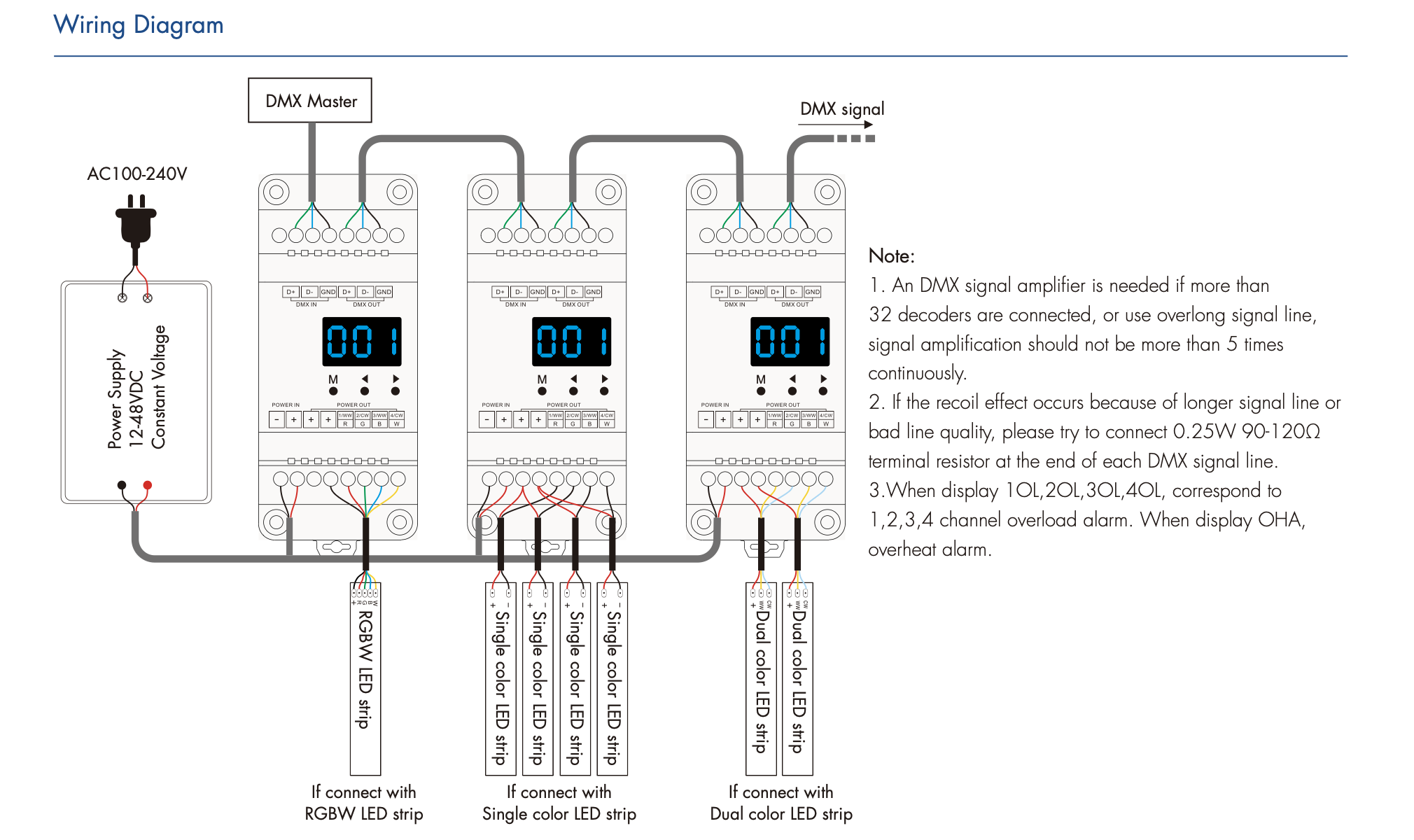 - Funkcja RDM umożliwia komunikację między konsolą DMX a dekoderem. Na przykład, adres dekodera DMX może być ustawiony przez konsolę DMX
