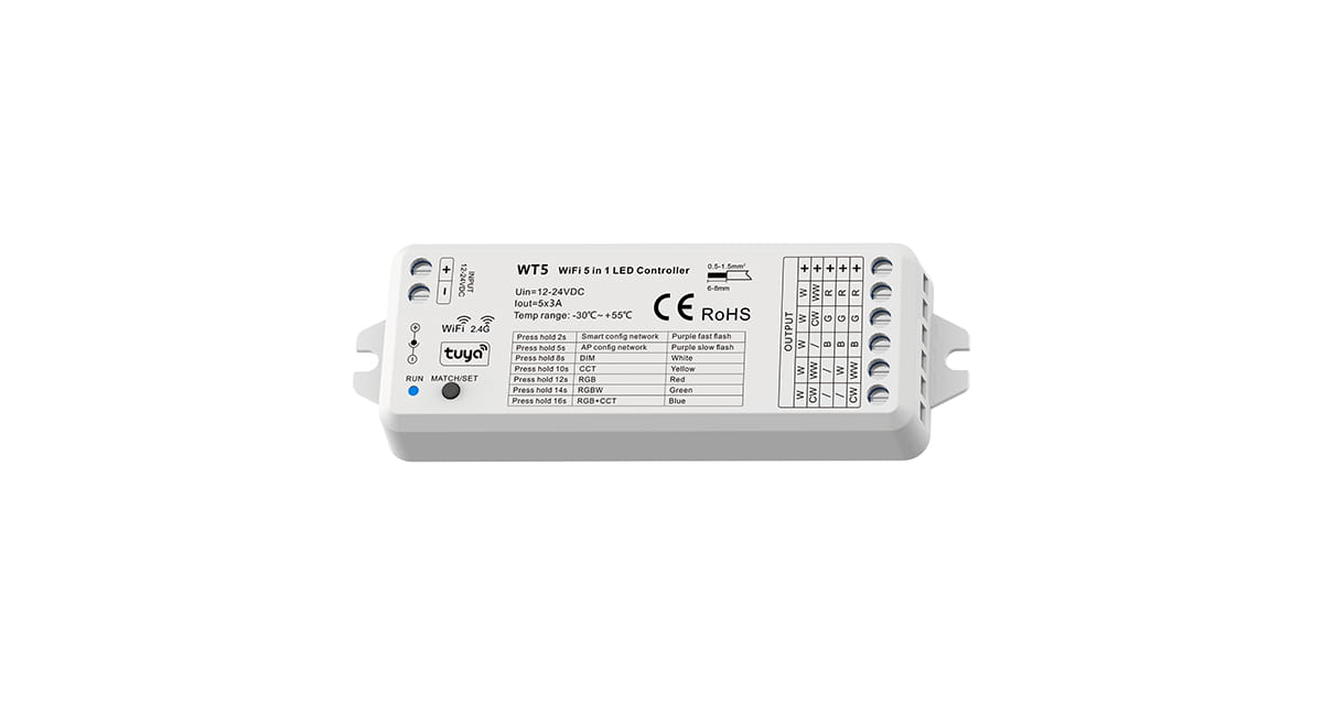 WT5 to 5-wyjściowy RF, WiFi sterownik firmy Skydance przeznaczony głównie do kolorowych taśm LED.