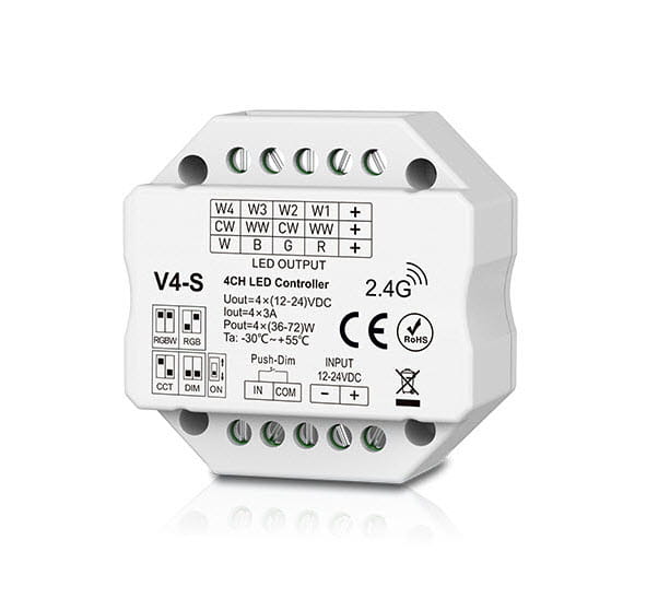 Czterokanałowy radiowy sterownik-ściemniacz LED V4-S służy do sterowania taśm LED mono/CCT/RGB/RGBW.