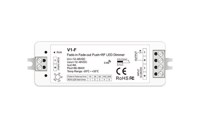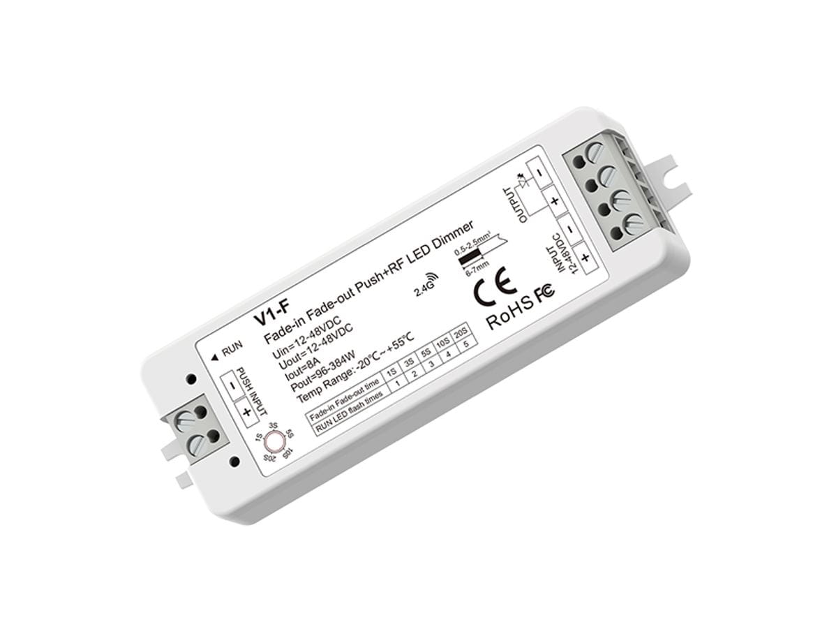 Jedno-wyjściowy radiowy sterownik-ściemniacz LED V1-F służy do zarządzania natężeniem światła emitowanego przez jednokolorową taśmę LED.
