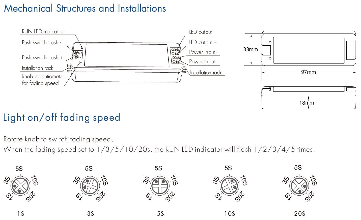 - Fade-in Fade-out Ściemniacz LED z płynnym efektem zanikania dla miękkiego startu i zatrzymania.