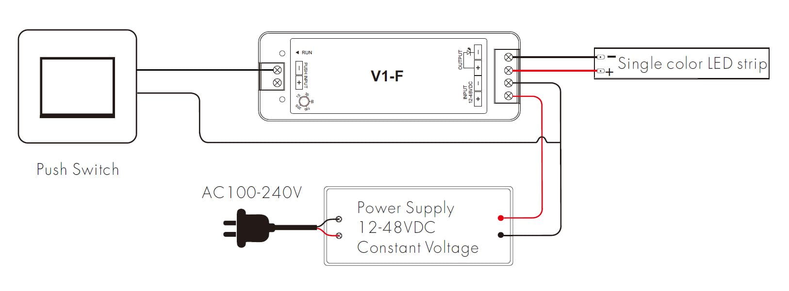 - Podłącz za pomocą samoresetującego się metalowego przycisku lub przełącznika wciskanego, aby uzyskać funkcję włączania/wyłączania i ściemniania w zakresie 0-100%.