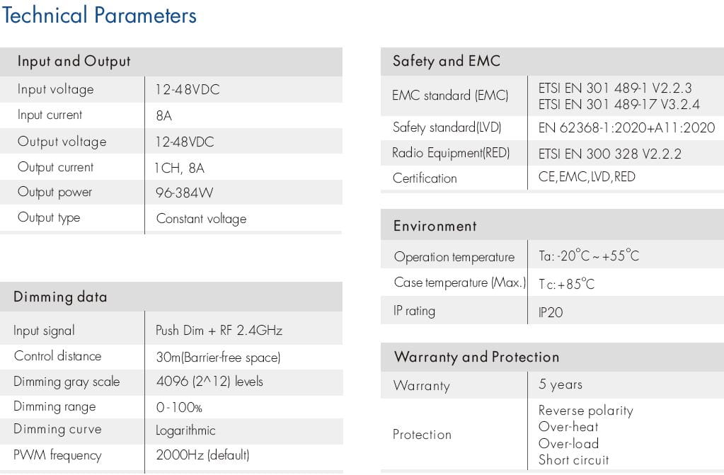 - Typ kontroli: pilot RF 2.4GHz, PUSH Dim (przewodowe)
