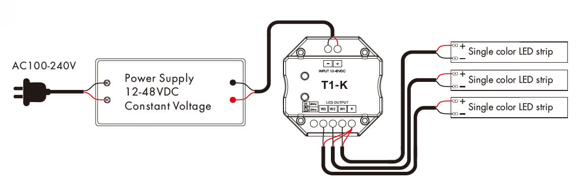 Sterownik T1-K(B) jest kompatybilny z taśmami Mono – monochromatyczna taśma (jedna barwa)