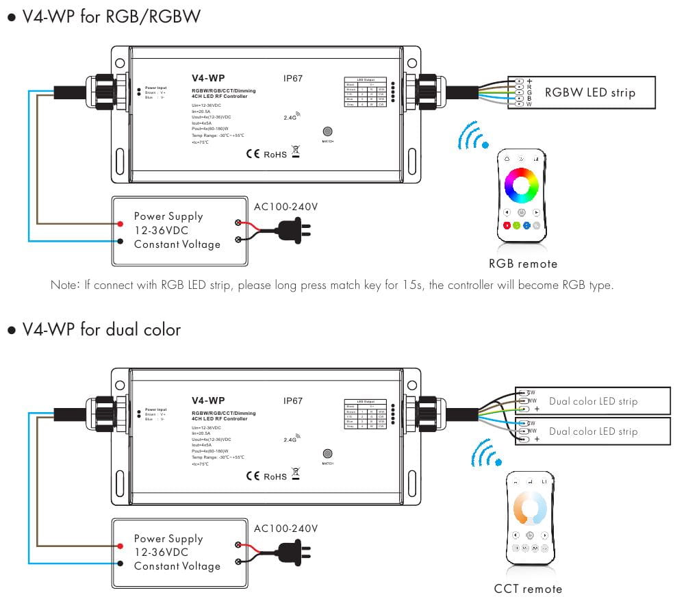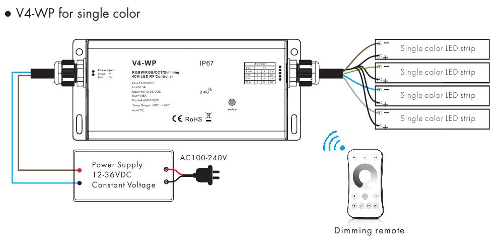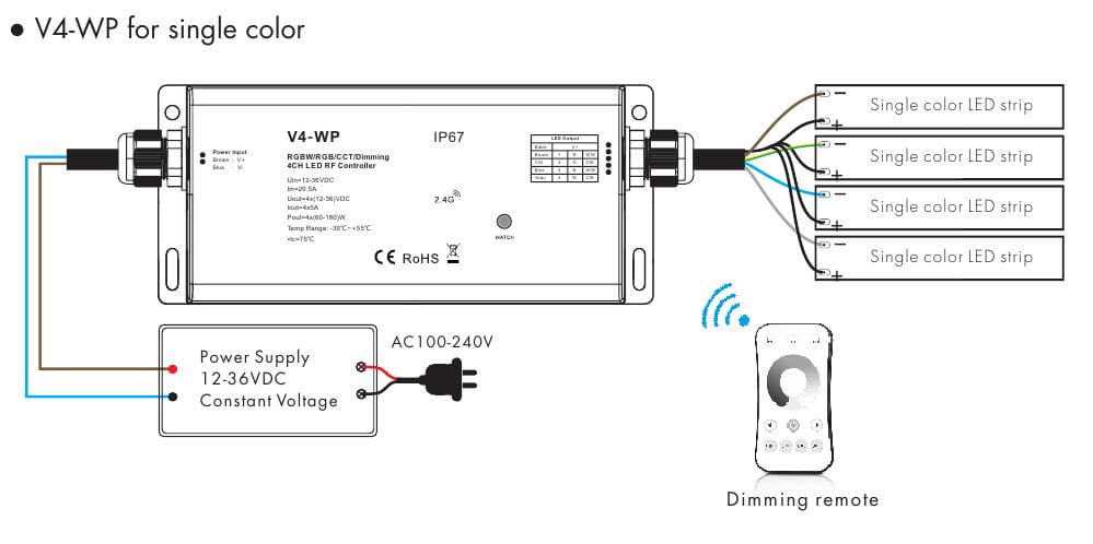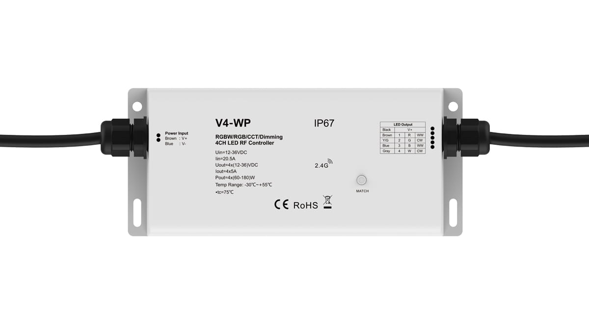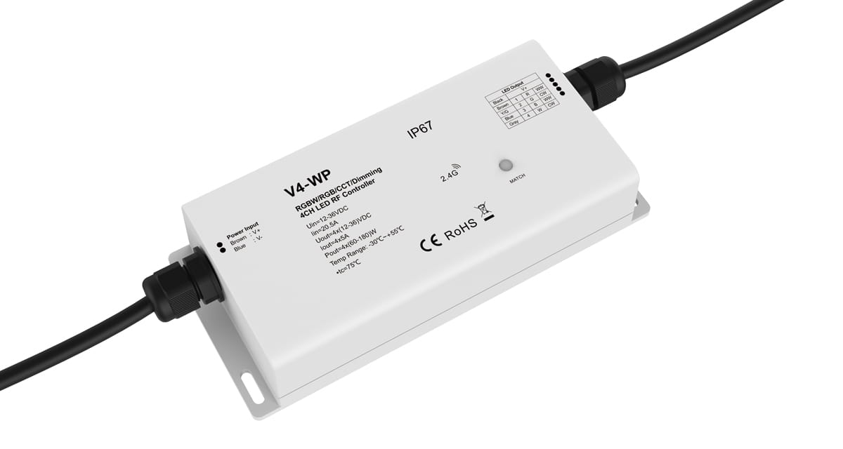 Czterokanałowy radiowy sterownik-ściemniacz LED V4-WP służy do sterowania taśm LED mono/CCT/RGB/RGBW.