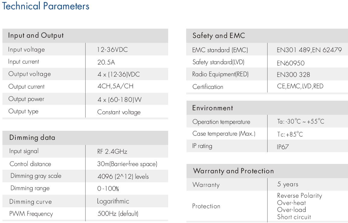 - Liczba kanałów wyjściowych: 4CH x 5A max