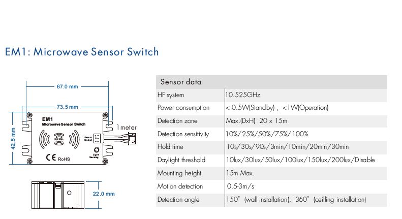 Czujnik mikrofalowy EM1 służy do włączania jednokolorowej taśmy LED na określony czas za pomocą detekcji ruchu z uwzględnieniem dodatkowego parametru jakim jest światło zewnętrzne.