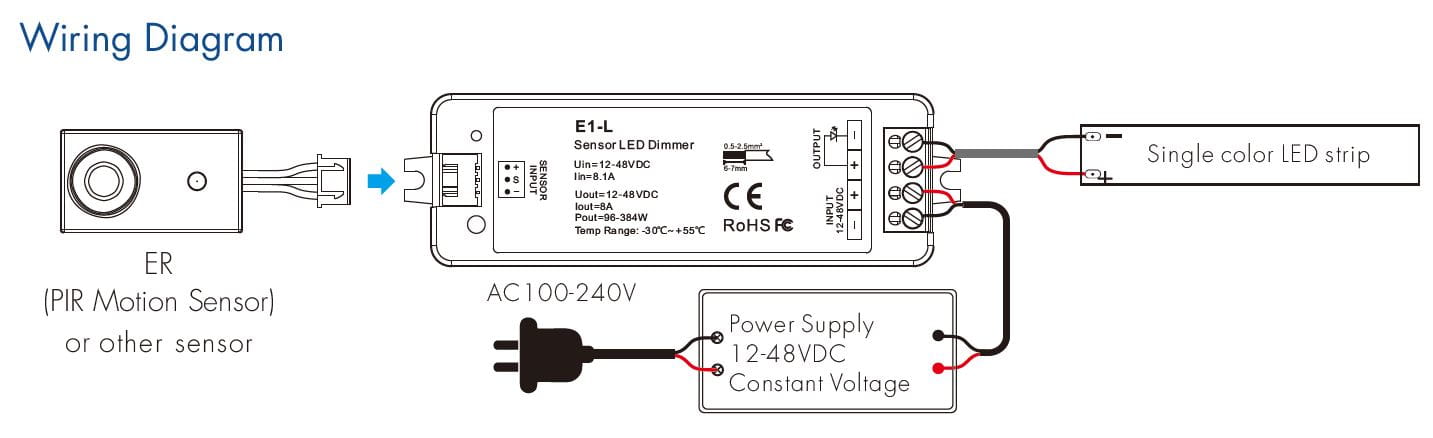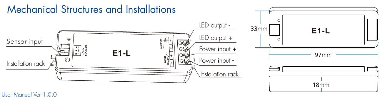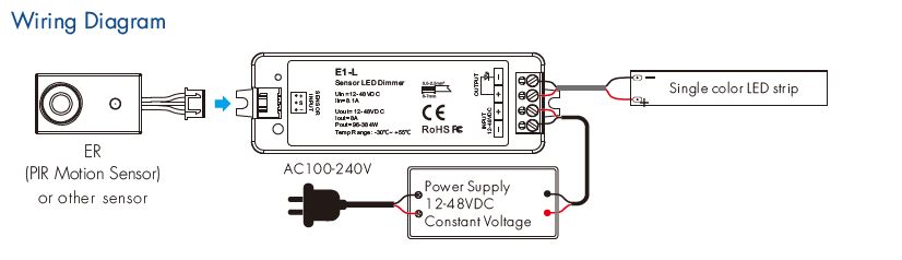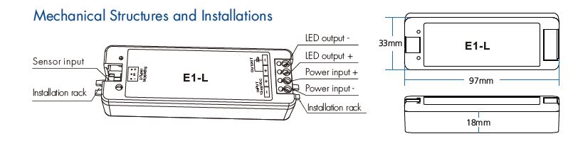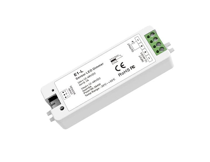 Ściemniacz LED E1-L to wielofunkcyjne urządzenie do sterowania jednokolorową taśmą LED z możliwością podłączenia 9 różnych sensorów: