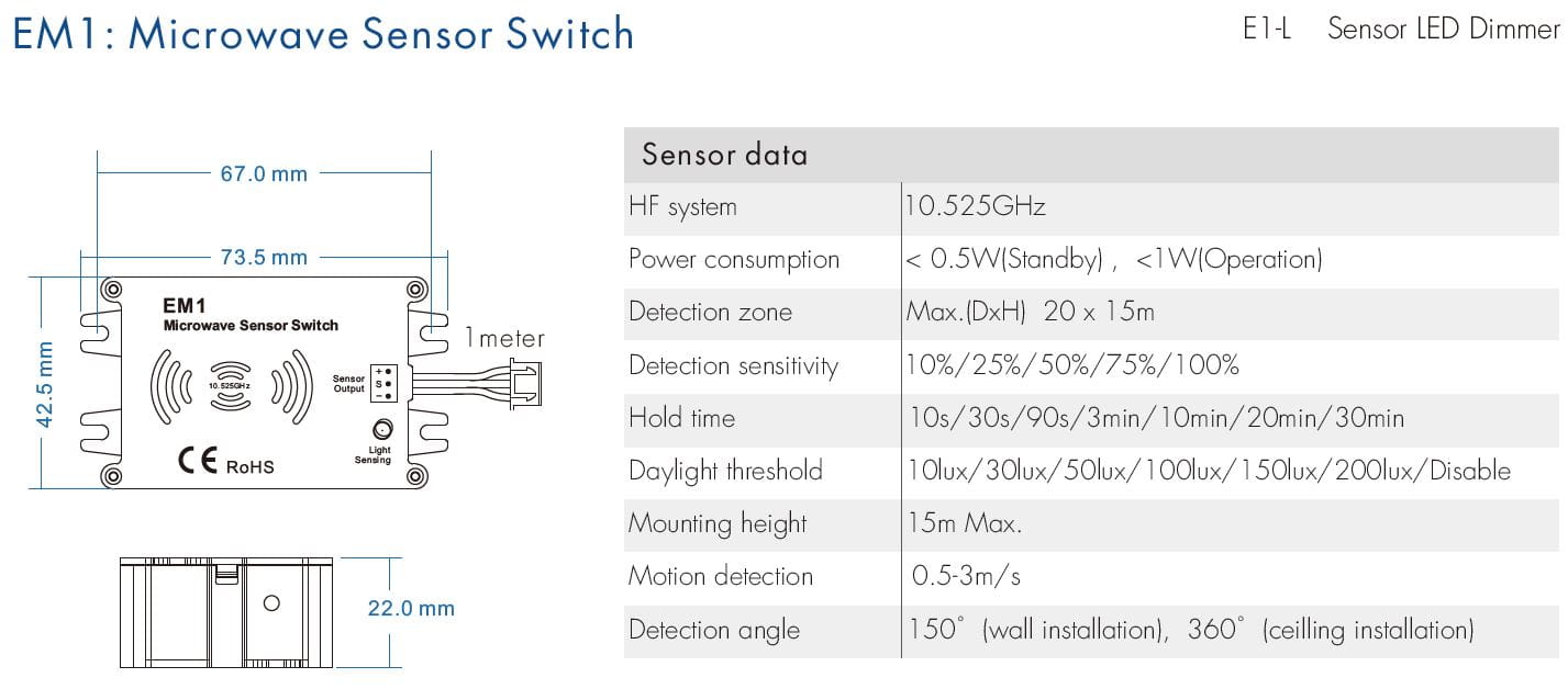- EM2: mikrofalowy przełącznik z funkcją ściemniania i czujnikiem natężenia oświetlenia