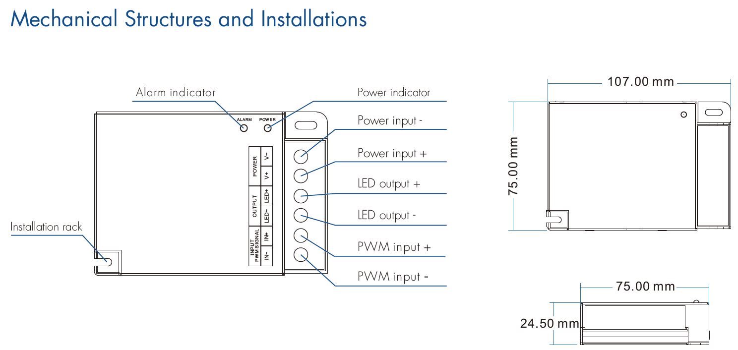 - Zabezpieczenie: Odwrotna polaryzacja, Przegrzanie, Zwarcie, Przeciążenie.