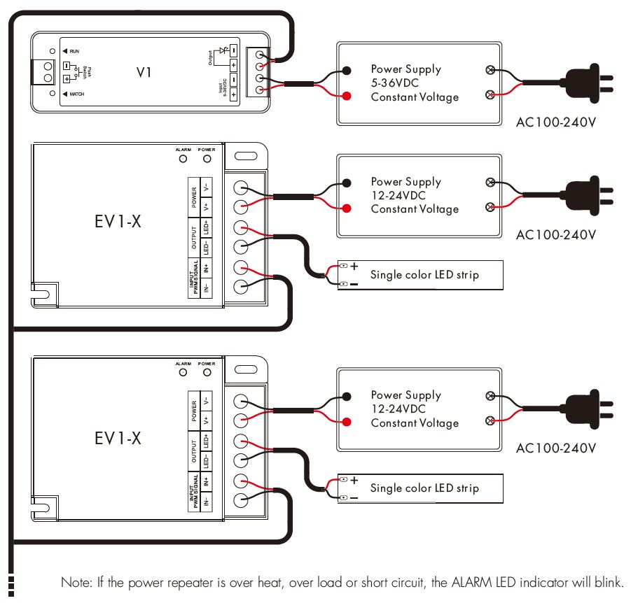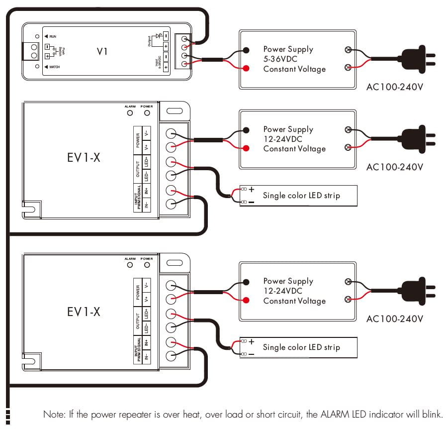 1-wyjściowy wzmacniacz LED EV1-X służy do zwiększenia mocy sterownika mono i umożliwia podłączenie większej ilości taśmy do 1 sterownika.