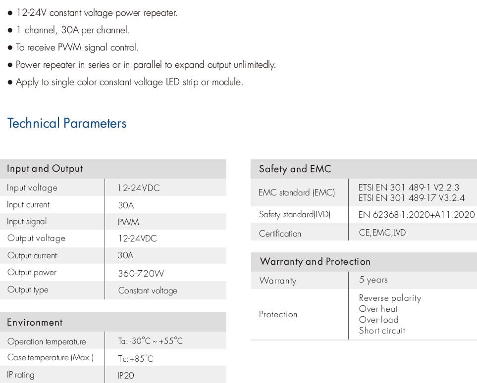 - Liczba kanałów wyjściowych: 1 x 30 A