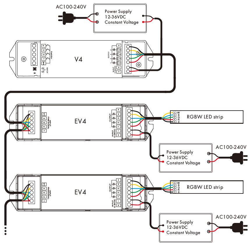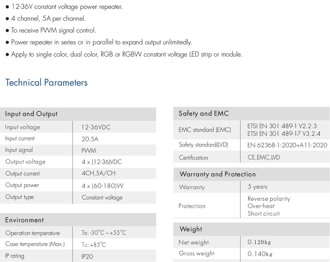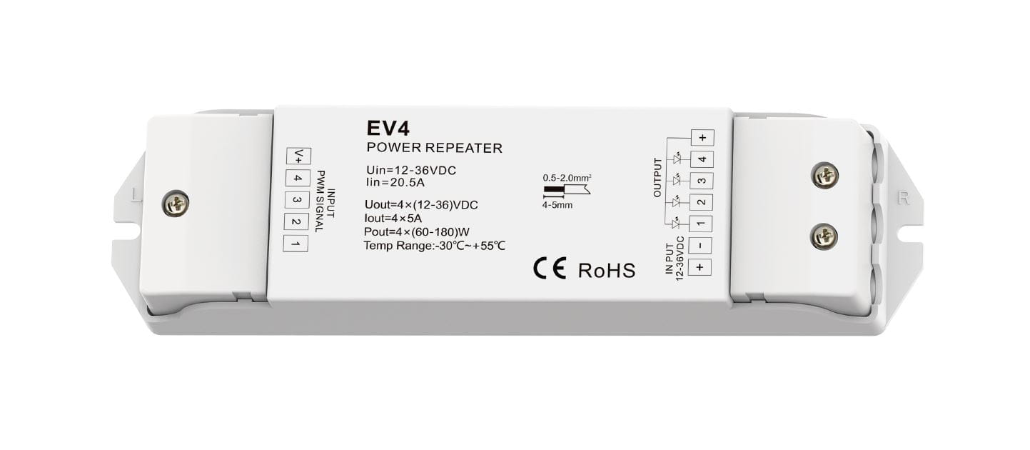 4-wyjściowy wzmacniacz LED EV4 służy do zwiększenia mocy sterownika mono/CCT/RGB/RGBW i umożliwia podłączenie większej ilości taśmy do 1 sterownika.