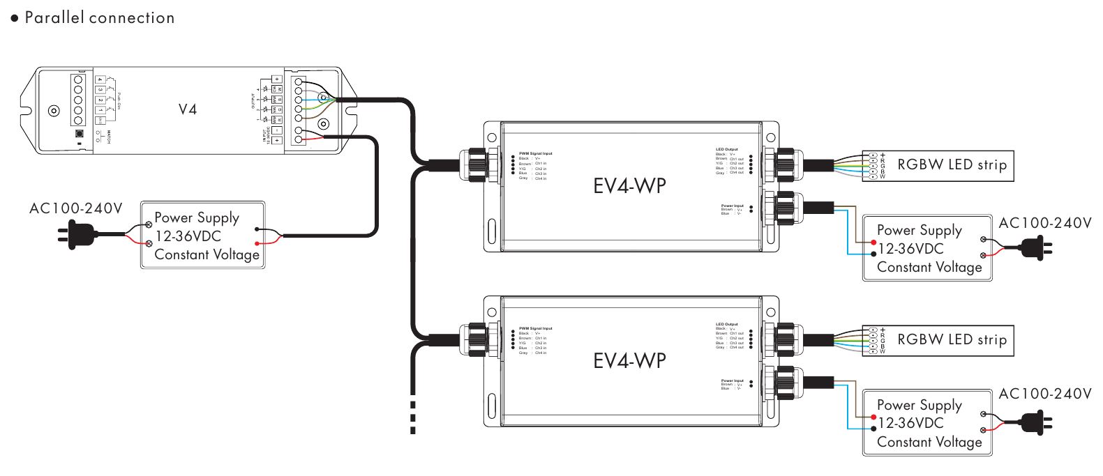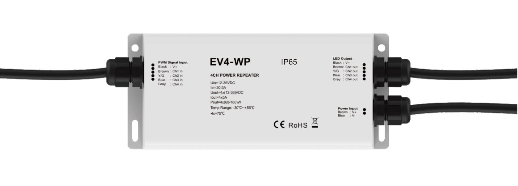 Wodoszczelny 4-wyjściowy wzmacniacz LED EV4-WP służy do zwiększenia mocy sterownika mono/CCT/RGB/RGBW i umożliwia podłączenie większej ilości taśmy do 1 sterownika. Nadaje się do środowiska zewnętrznego i wilgotnego.