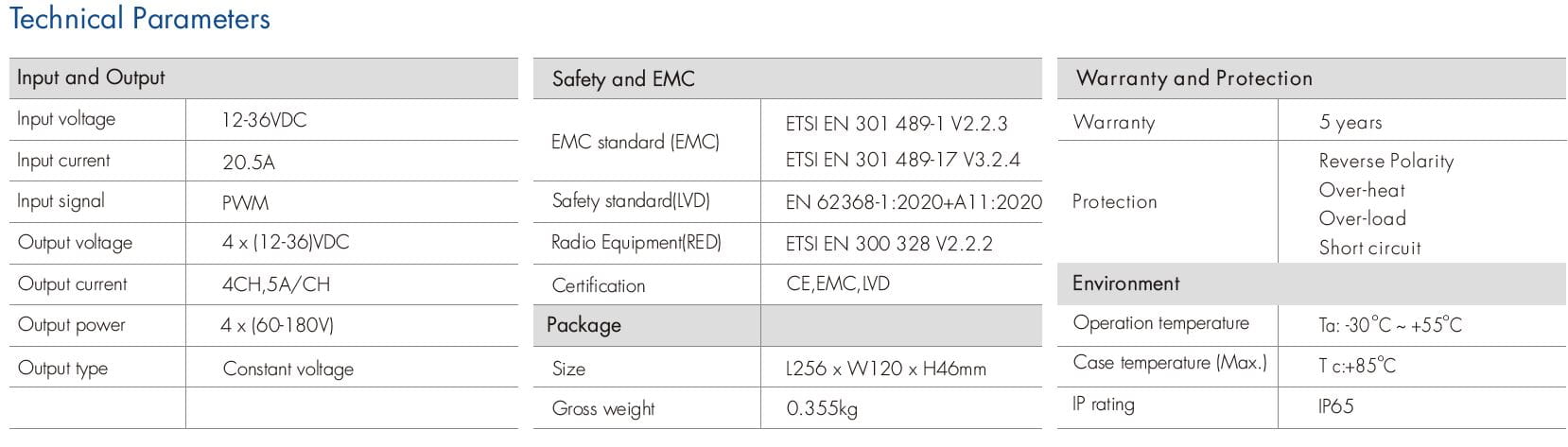 - Zabezpieczenie: Odwrotna polaryzacja, Przegrzanie, Zwarcie, Przeciążenie.