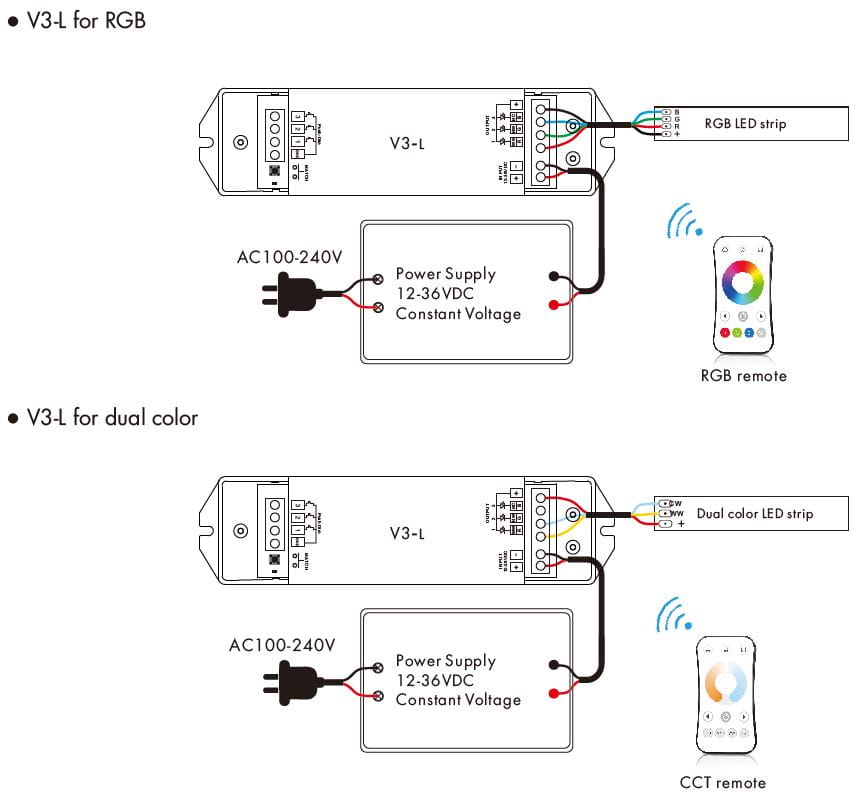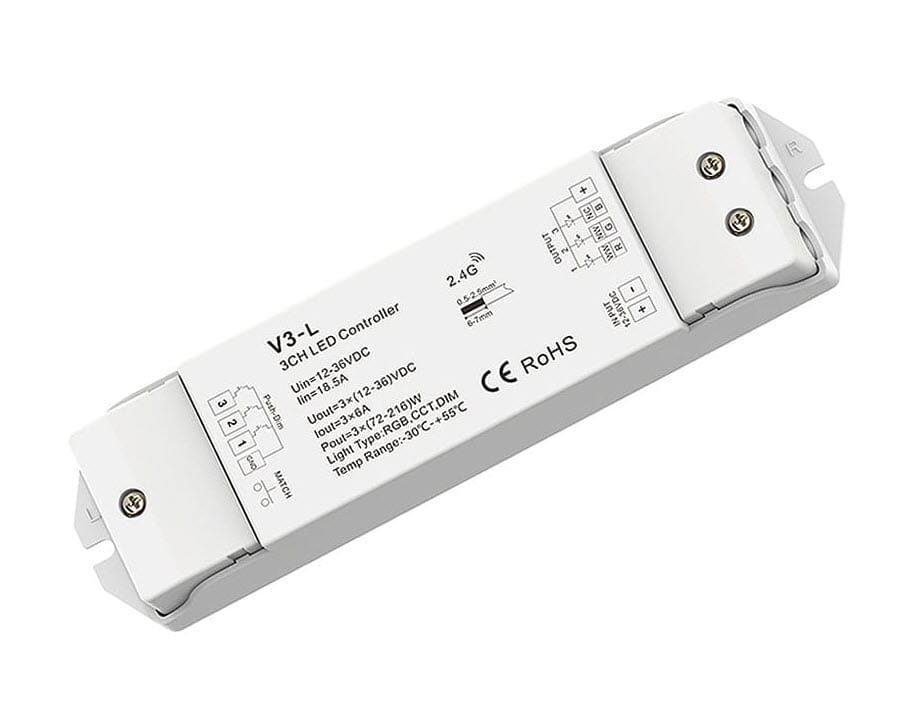 Trzykanałowy radiowy sterownik-ściemniacz LED V3-L służy do sterowania kolorowym światlem LED RGB (do taśmy LED RGB)