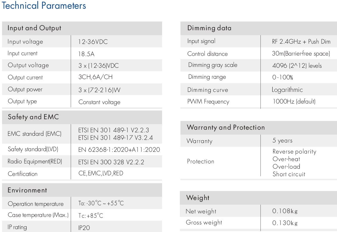 - Liczba kanałów wyjściowych: 3CH x 6A max
