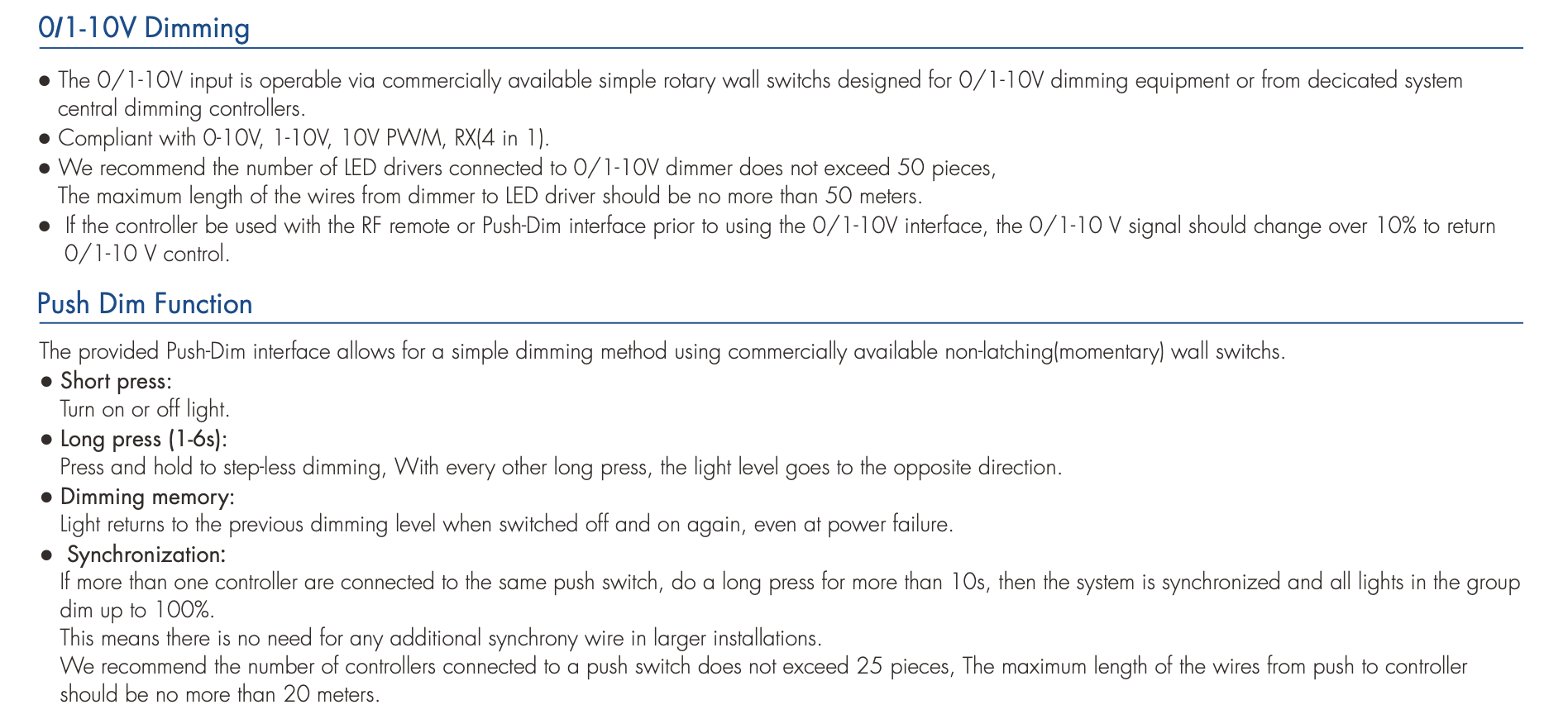 - Sterowanie przez Pilot RF, 0/1-10 V, Push Dim (3 w 1).