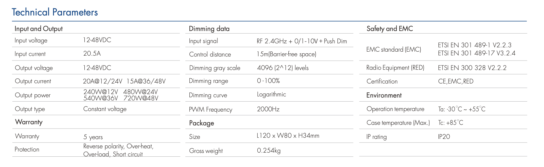 - Moc wyjściowa max: 240W(12V) / 480W(24V)