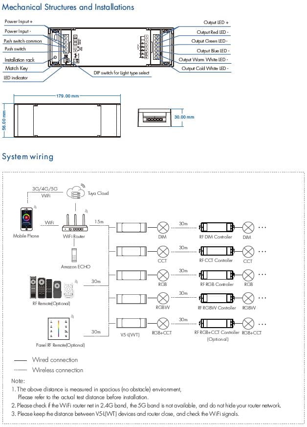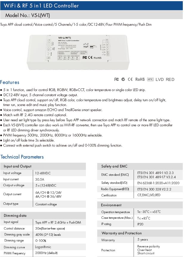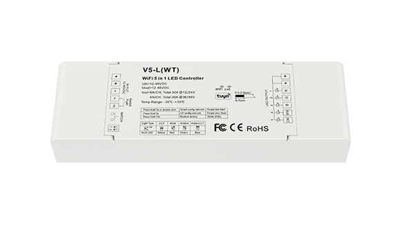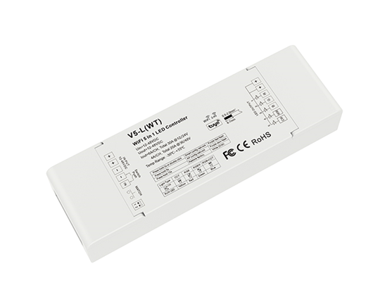 V5-L(WT) to 5-wyjściowy RF, WiFi sterownik firmy Skydance przeznaczony głównie do kolorowych taśm LED.