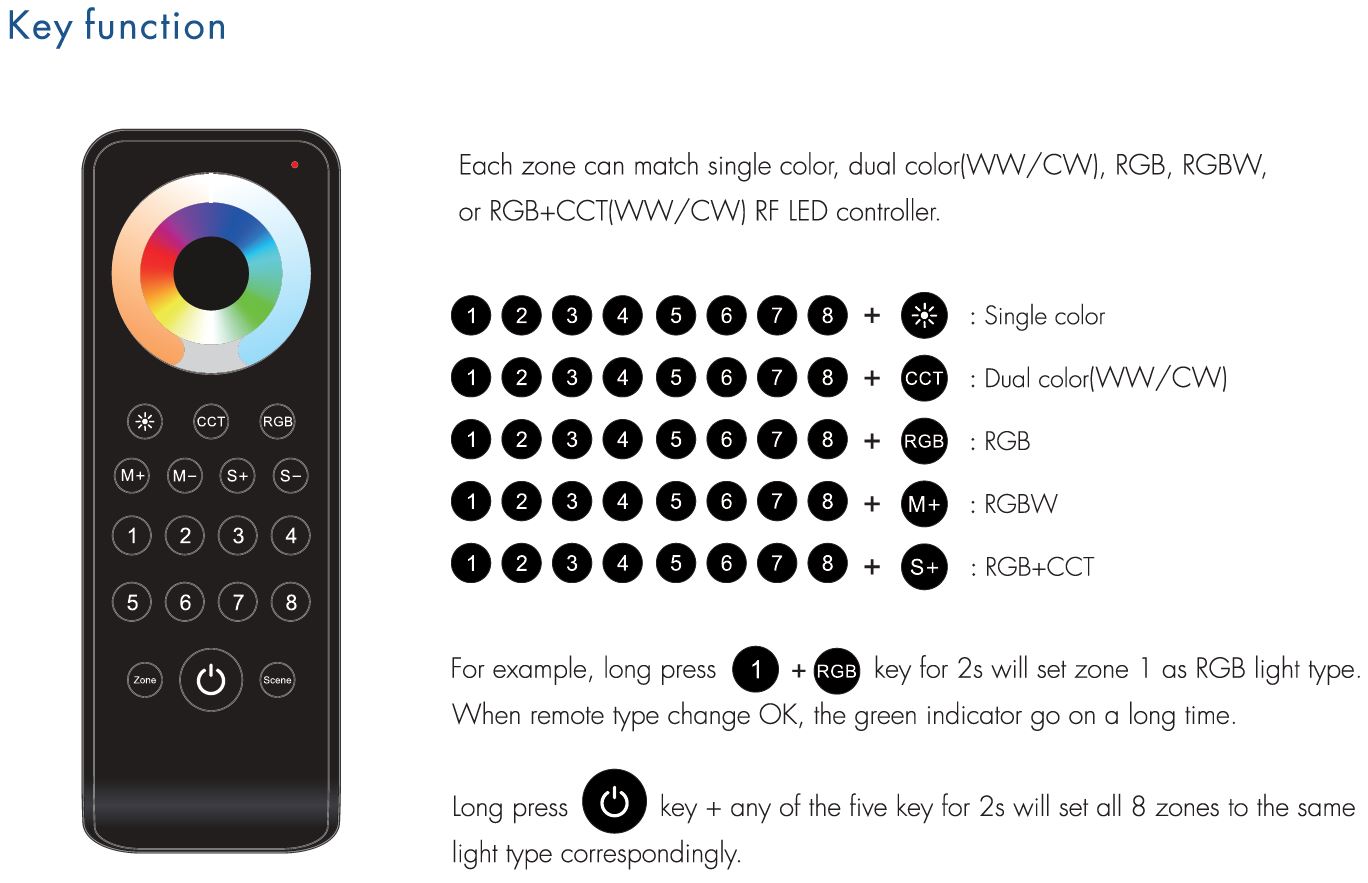 - Możliwość parowania do 10 pilotów radiowych z jednym sterownikem RF. Daje to możliwość sterowania jednym kontrolerem z kilku różnych lokalizacji.