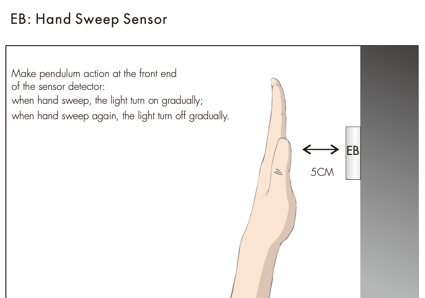 - Kiedy przemieszczenie dłoni jest wykrywane przez czujnik, światło włącza się stopniowo