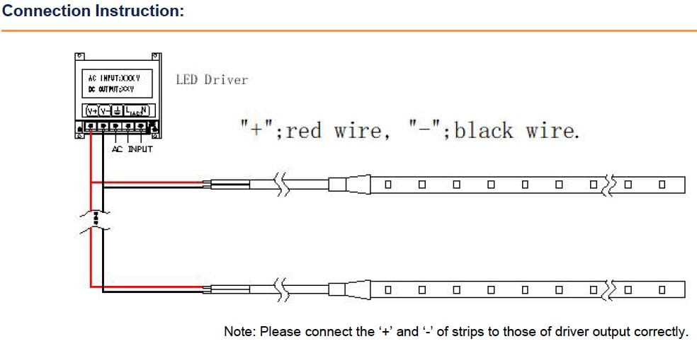 Preferowany sposób podłączenia: Połączenie dwustronne rolki 5m, z jednej strony nie więcej 5m taśmy LED.