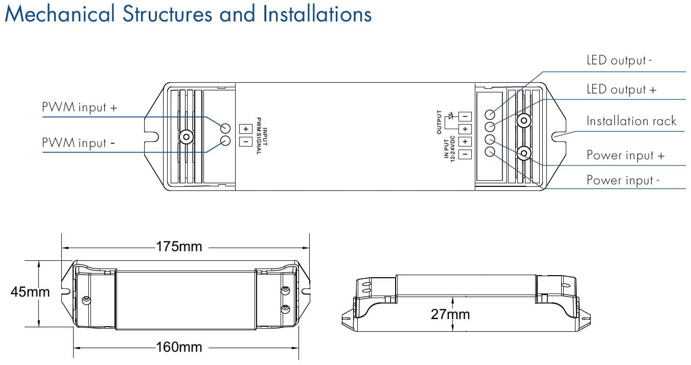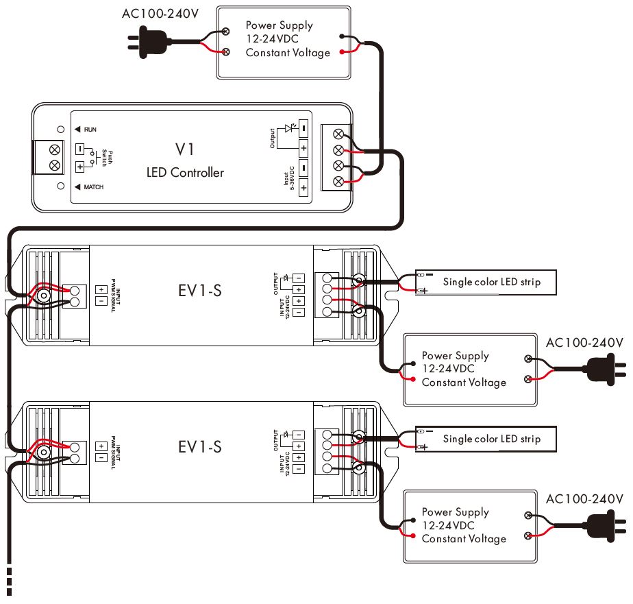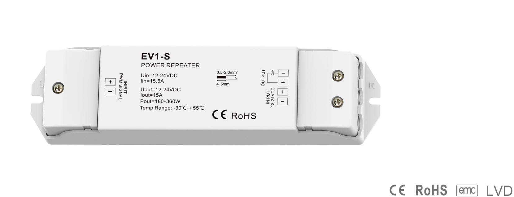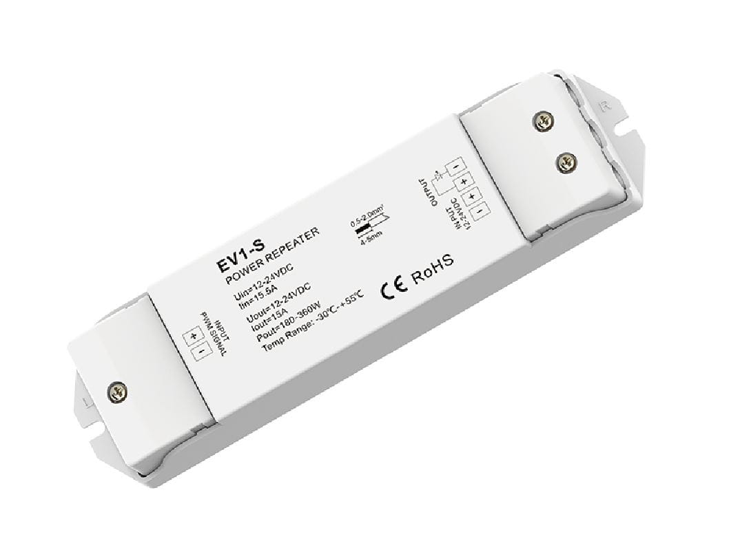 1-wyjściowy wzmacniacz LED EV1-S służy do zwiększenia mocy sterownika mono i umożliwia podłączenie większej ilości taśmy do 1 sterownika.