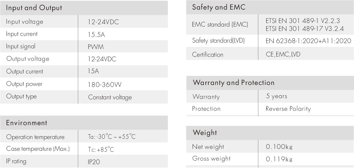 - Liczba kanałów wyjściowych: 1 x 15 A