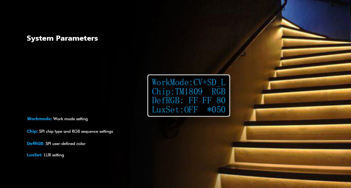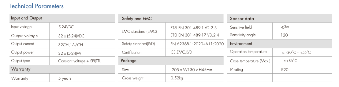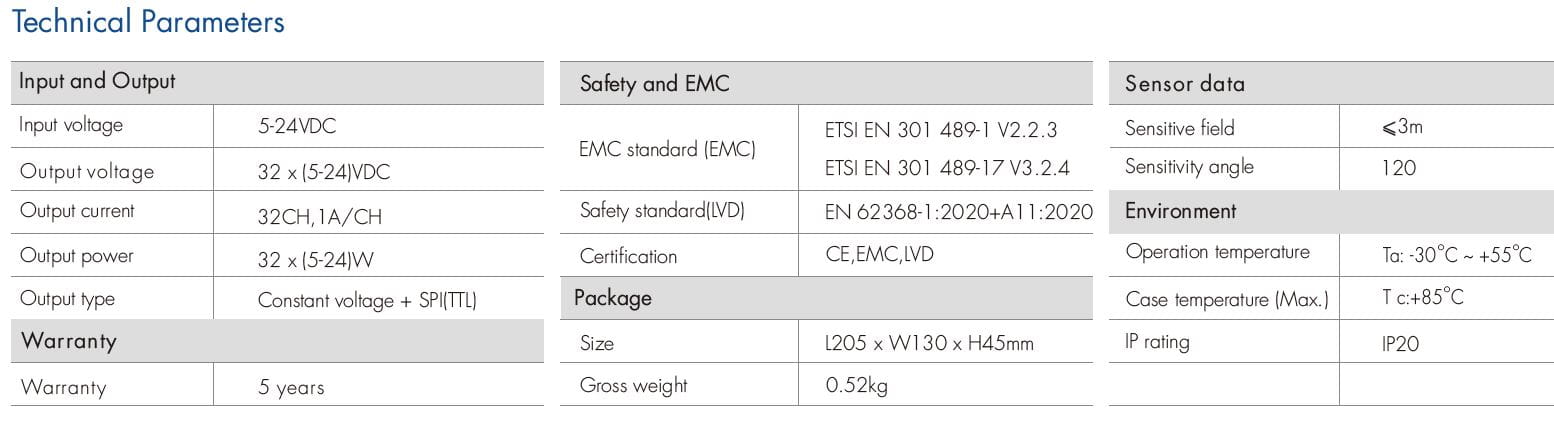 - 2 grupy wyjść sygnału SPI (TTL), obsługa 28 typów cyfrowych taśm LED RGB, możliwość ustawienia typu układu scalonego i kolejności R/G/B