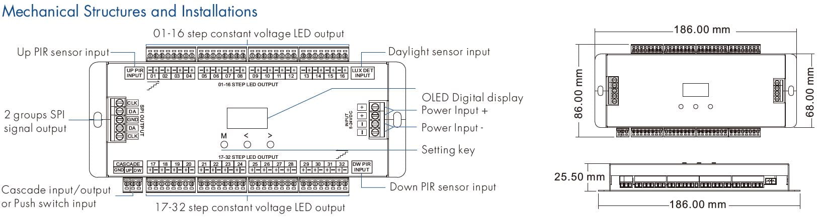 - 32-kanałowe wyjście napięcia stałego do zasilania taśm LED niskonapięciowych, maksymalnie 1A na kanał