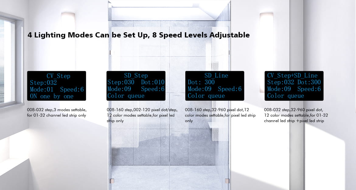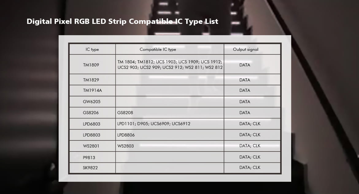 - TM1804, TM1809, TM1812, UCS1903, UCS1909, UCS1912, UCS2903, UCS2909, UCS2912, WS2811, WS2812, TM1829, TM1914A, GW6205, GS8206, GS8208, LPD6803, LPD1101, D705, UCS6909, UCS6912, LPD8803, LPD8806, WS2801, WS2803, P9813, SK9822, SM16703P