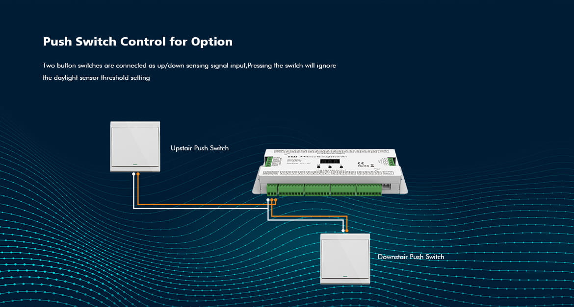 - Możliwość kaskadowego połączenia dwóch kontrolerów schodowych