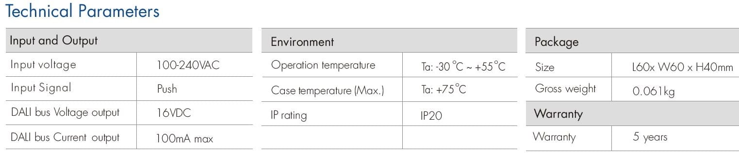 - Może być używany jako zasilacz magistrali DALI w celu zapewnienia zasilania.