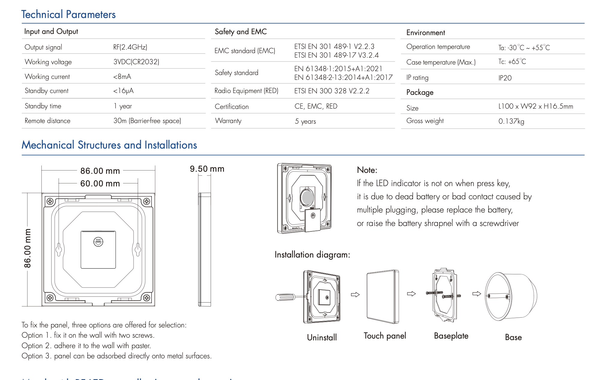 • Panel dotykowy 1-strefowy, RGB/RGBW, RF nadajnik