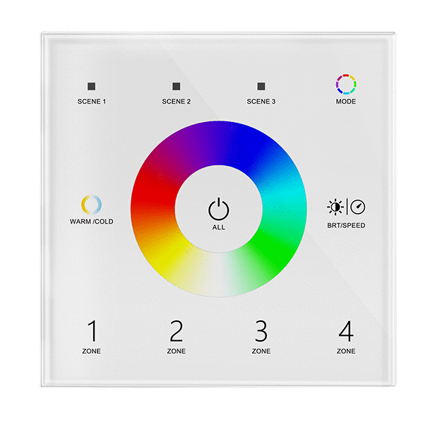 • Panel dotykowy 4 strefowy RGB+CCT DMX512 master, może również być używany jako 4 strefowy RGB+CCT pilot RF
