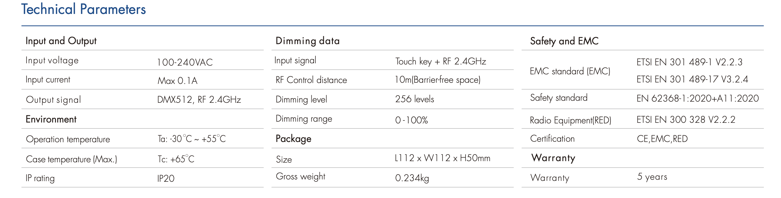 • Sygnał wyjściowy: DMX512, RF 2.4GHz