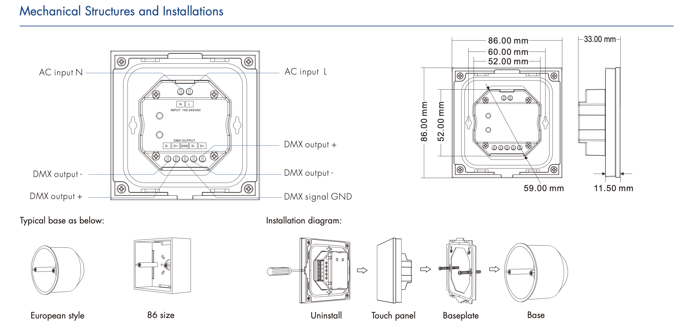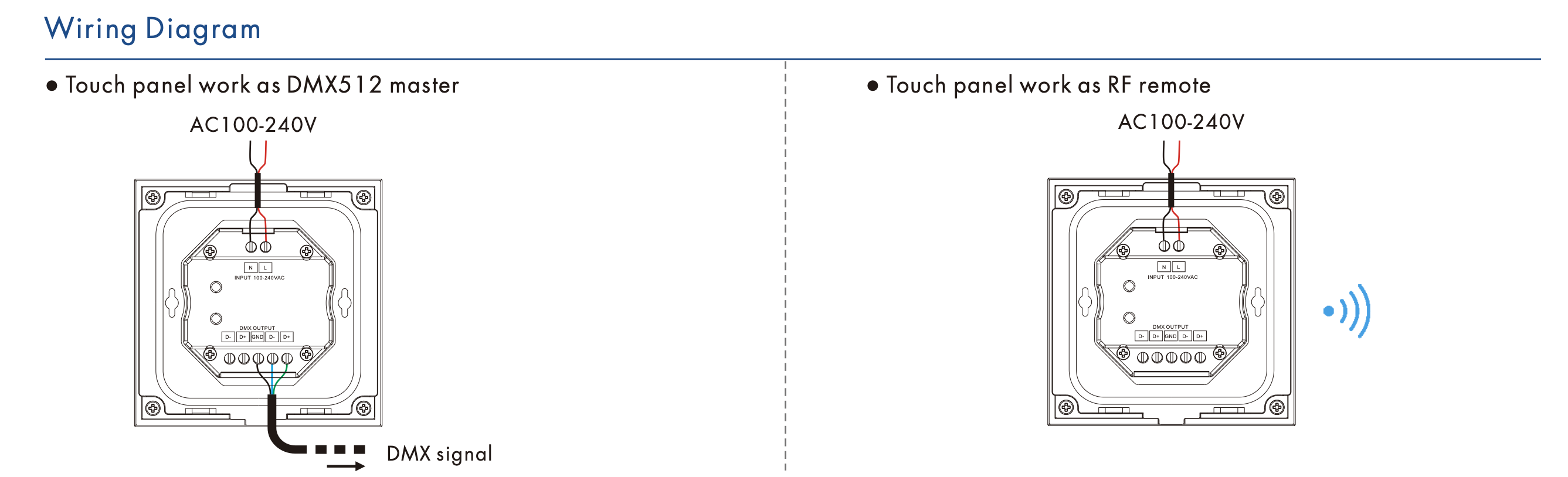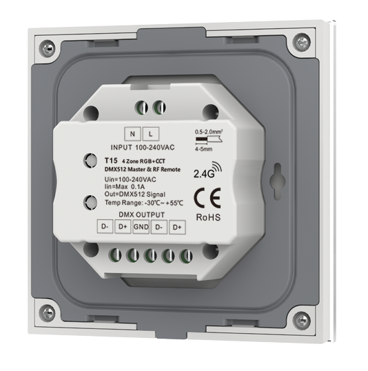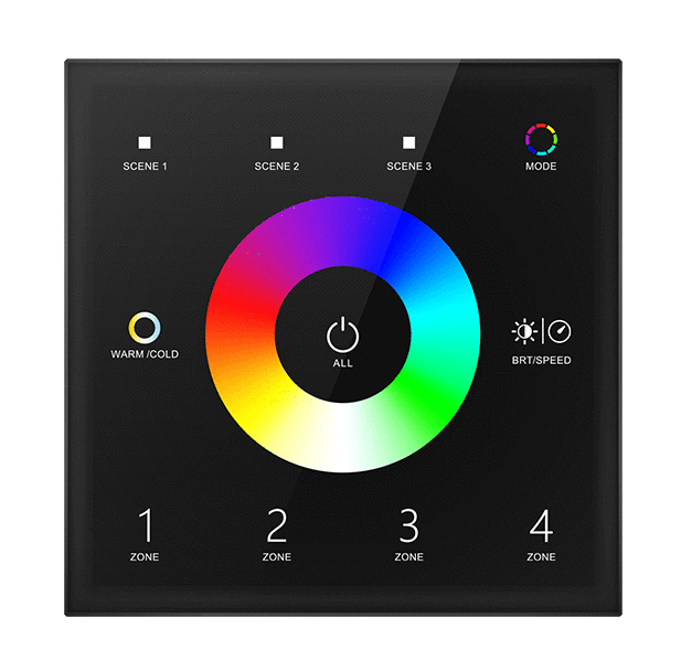 - Panel dotykowy 4 strefowy RGB+CCT DMX512 master, może również być używany jako 4 strefowy RGB+CCT pilot RF