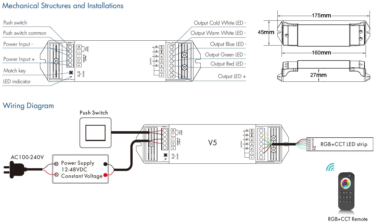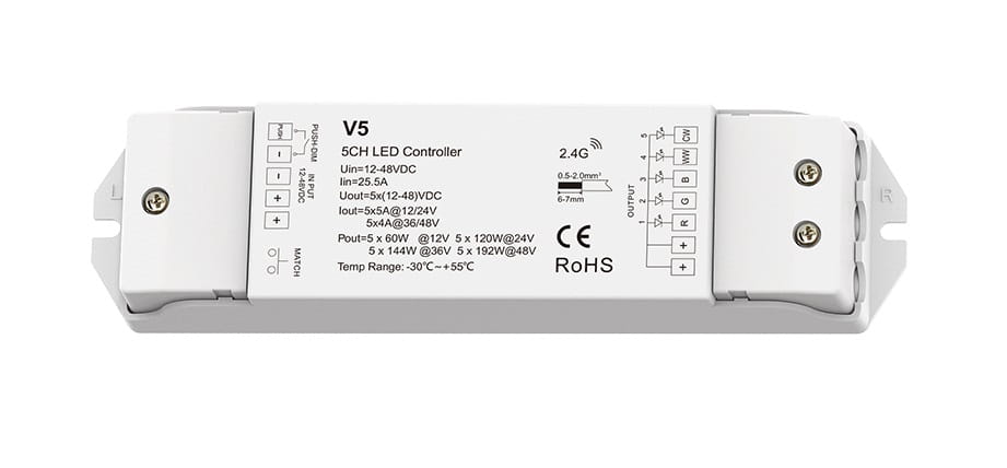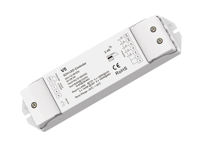 V5 to 5-wyjściowy sterownik, odbiornik RF firmy Skydance przeznaczony do kolorowych taśm LED RGBCCT.