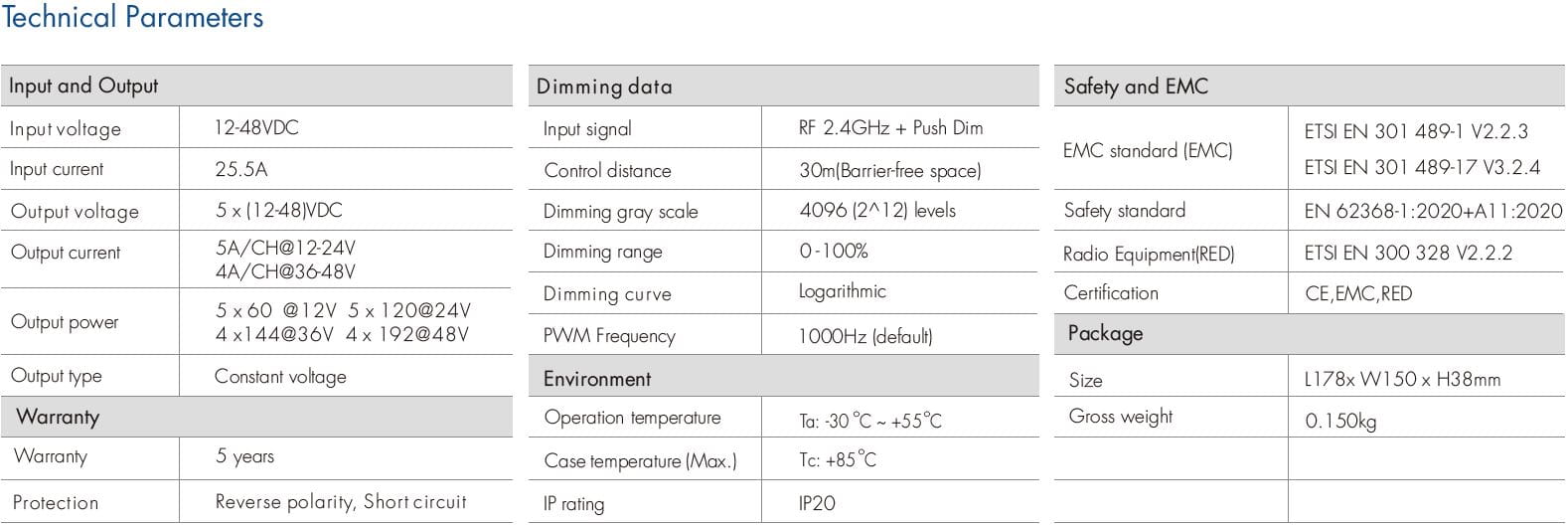 • Moc wyjściowa: MAX 5x60W (przy 12V) oraz 5x 120W (przy 24V).