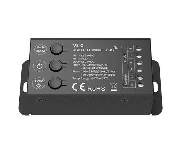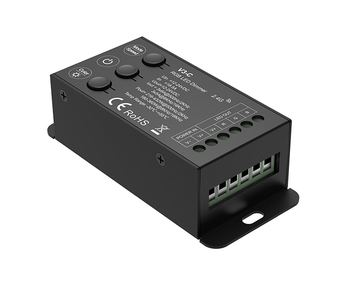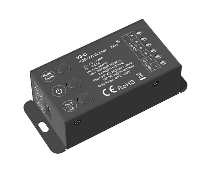 Trzykanałowy radiowy sterownik-ściemniacz LED V3-C służy do sterowania kolorowym światlem LED RGB (do taśmy LED RGB)