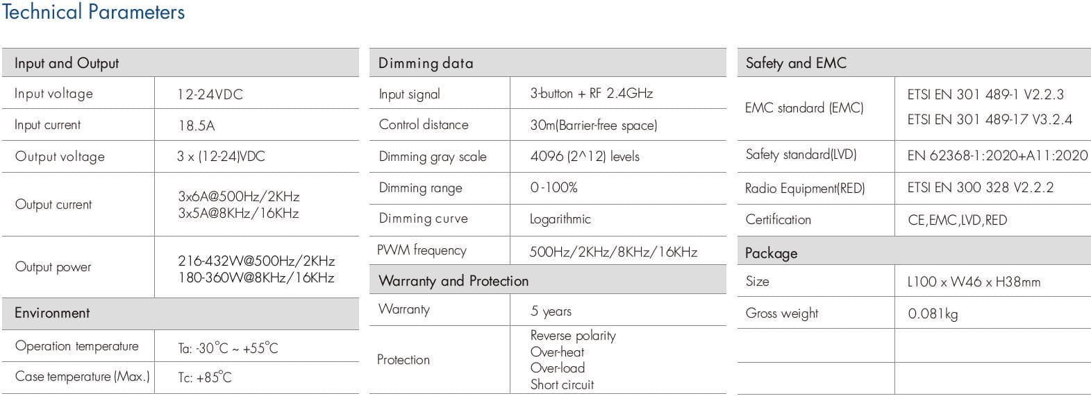 - Zgodność z normami: CE, RoHS.