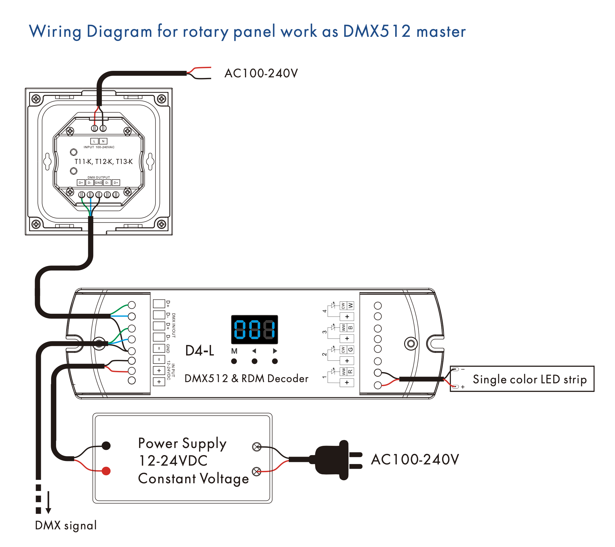- Panel obrotowy do sterowania jednokolorowym, dwukolorowym lub RGB DMX512 master, może również być używany jako pilot RF jednej strefy