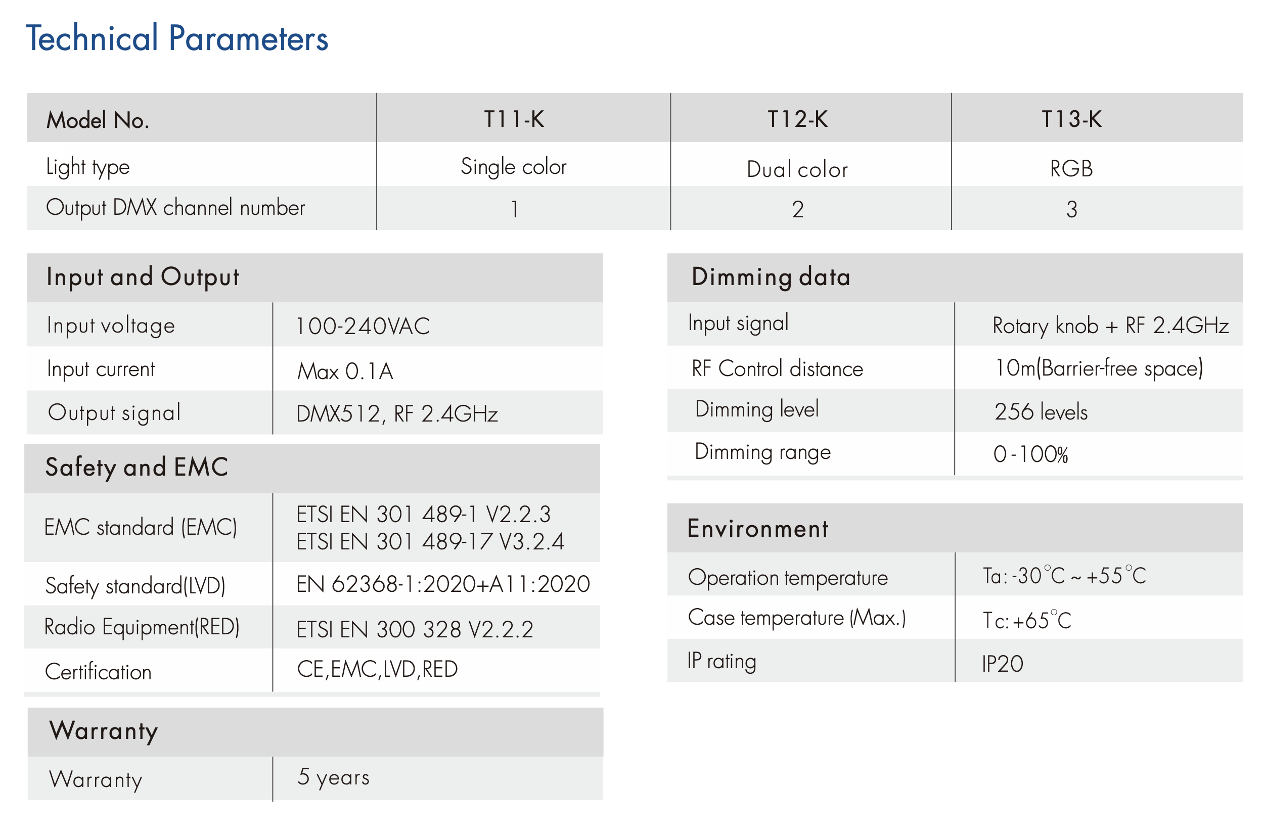 - Sygnał wyjściowy: DMX512, RF 2.4GHz