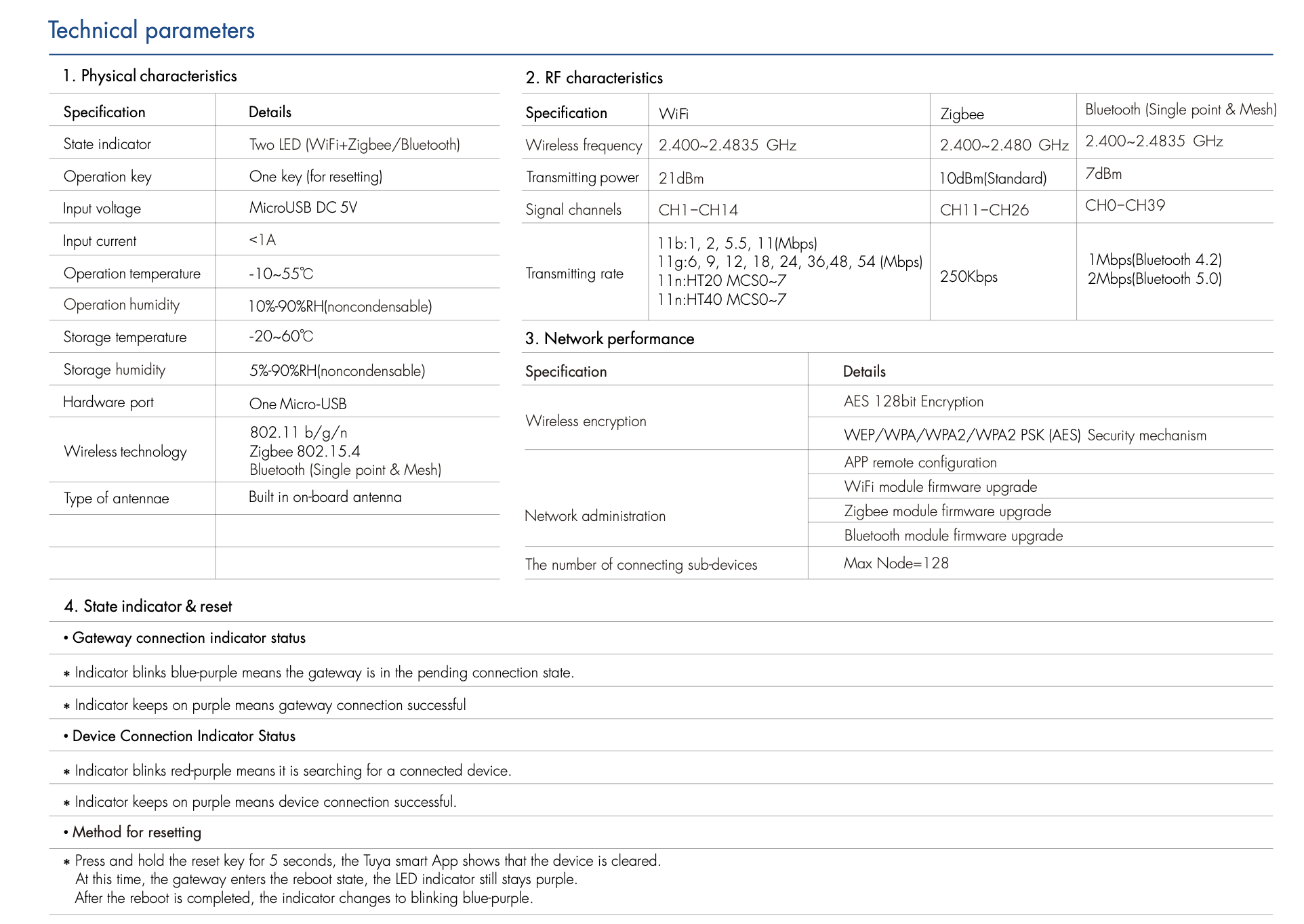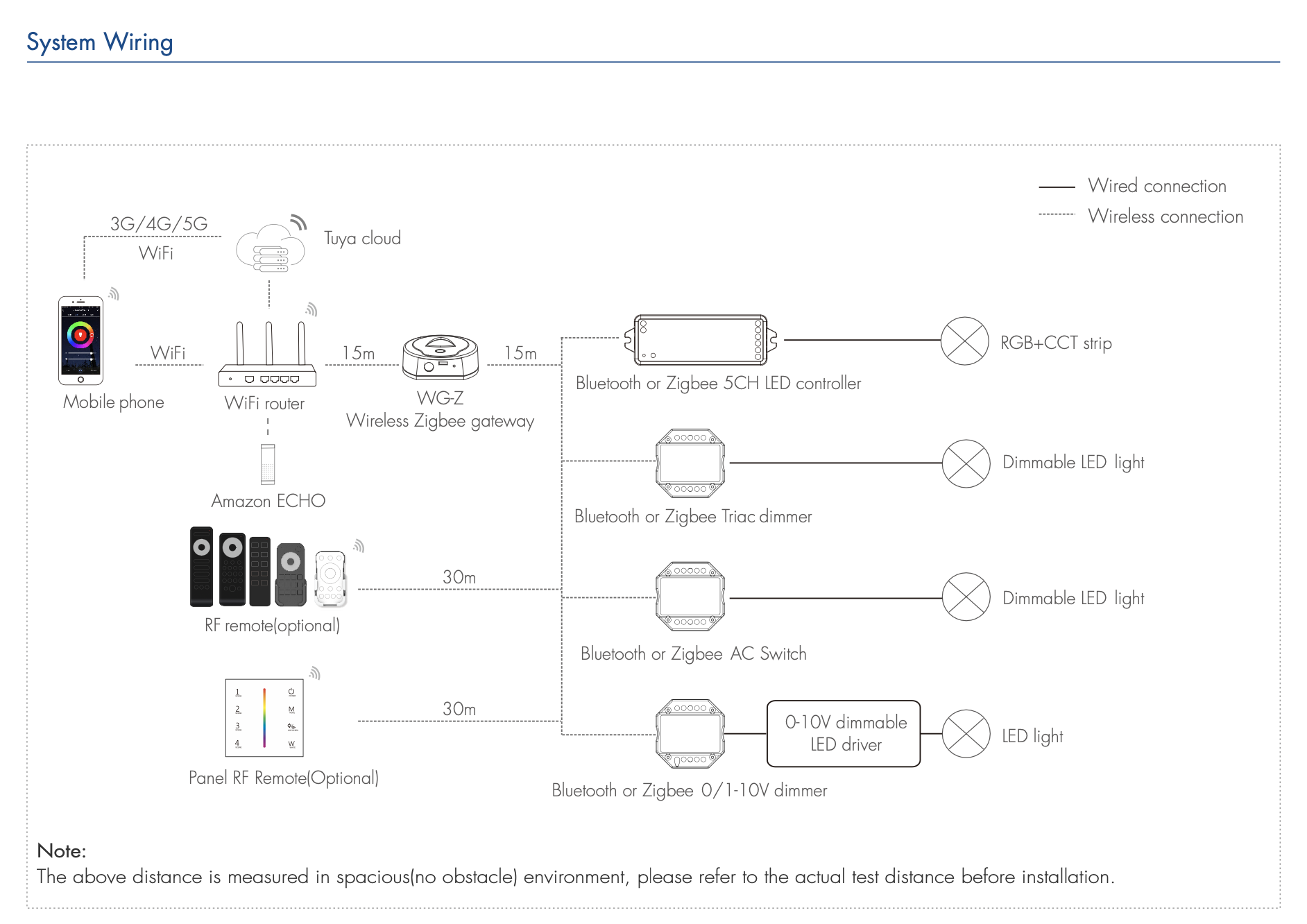 Sterownik WG-Z to bezprzewodowa bramka Zigbee z wbudowanym wysoko zintegrowanym modułem Wi-Fi, energooszczędnym modułem Bluetooth oraz energooszczędnym modułem Zigbee. W aplikacji Tuya Smart Life użytkownicy mogą dodawać urządzenia, resetować, sterować za pomocą systemów firm trzecich, kontrolować grupy Bluetooth (pojedynczy punkt i Mesh) oraz grupy Zigbee. Kompatybilna z szeroką gamą sterowników LED o stałym napięciu Bluetooth lub Zigbee (1-5 kolorów), ściemniaczami triakowymi Bluetooth lub Zigbee, ściemniaczami 0/1-10V Bluetooth lub Zigbee oraz sterownikami LED do ściemniania Bluetooth lub Zigbee, zapewniając inteligentne rozwiązania dla domu.
