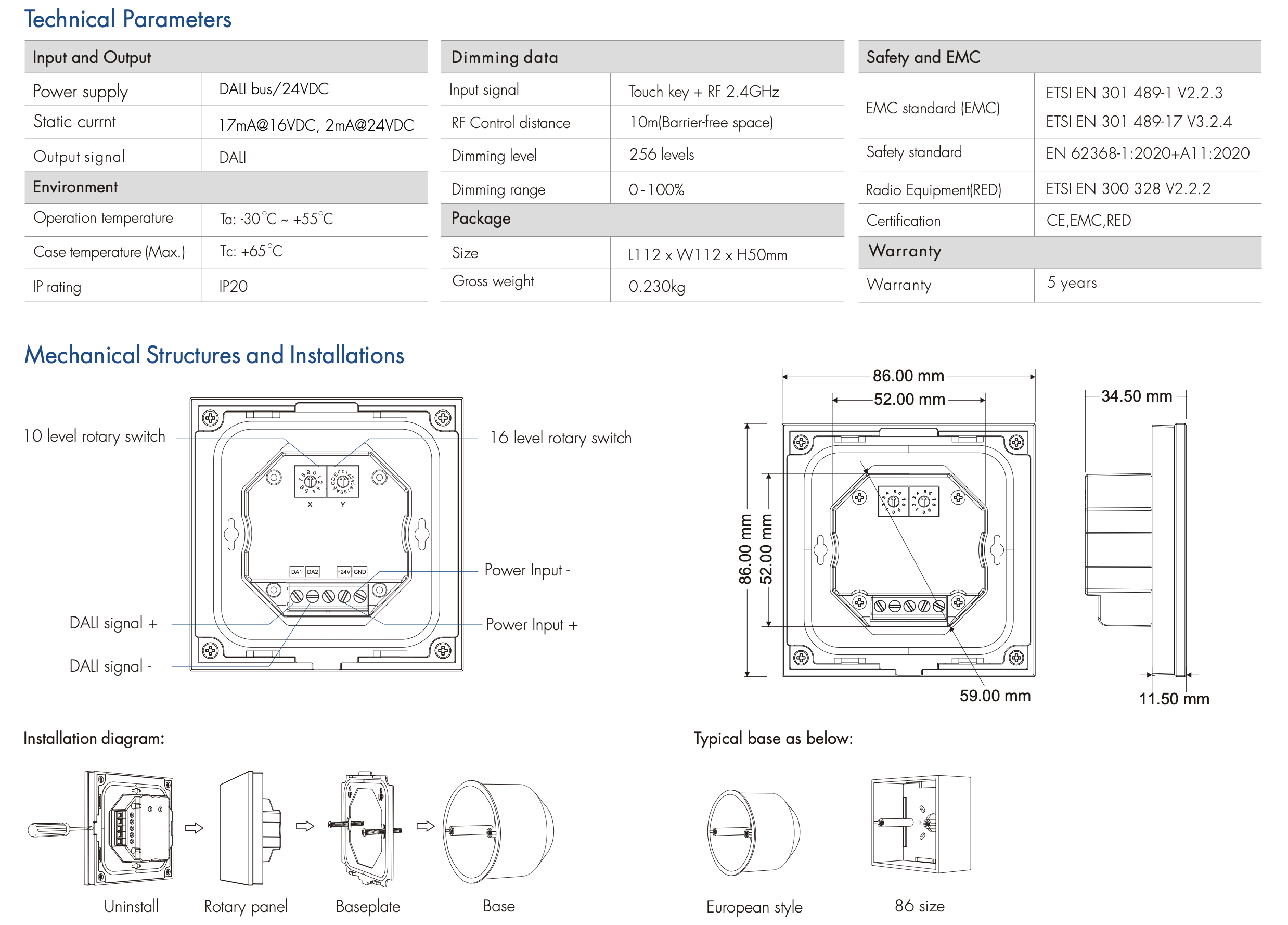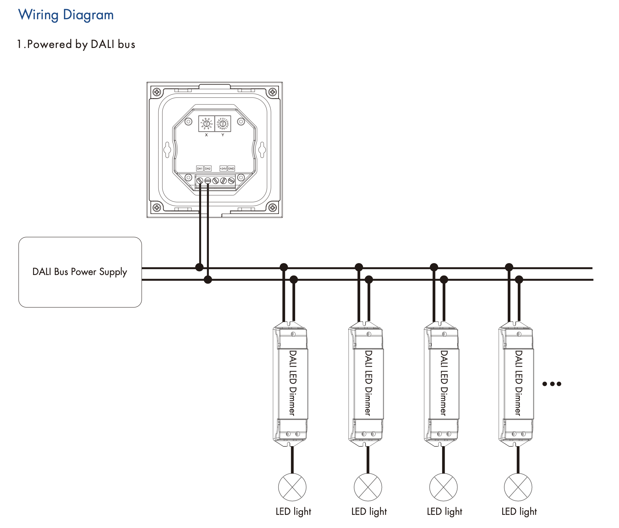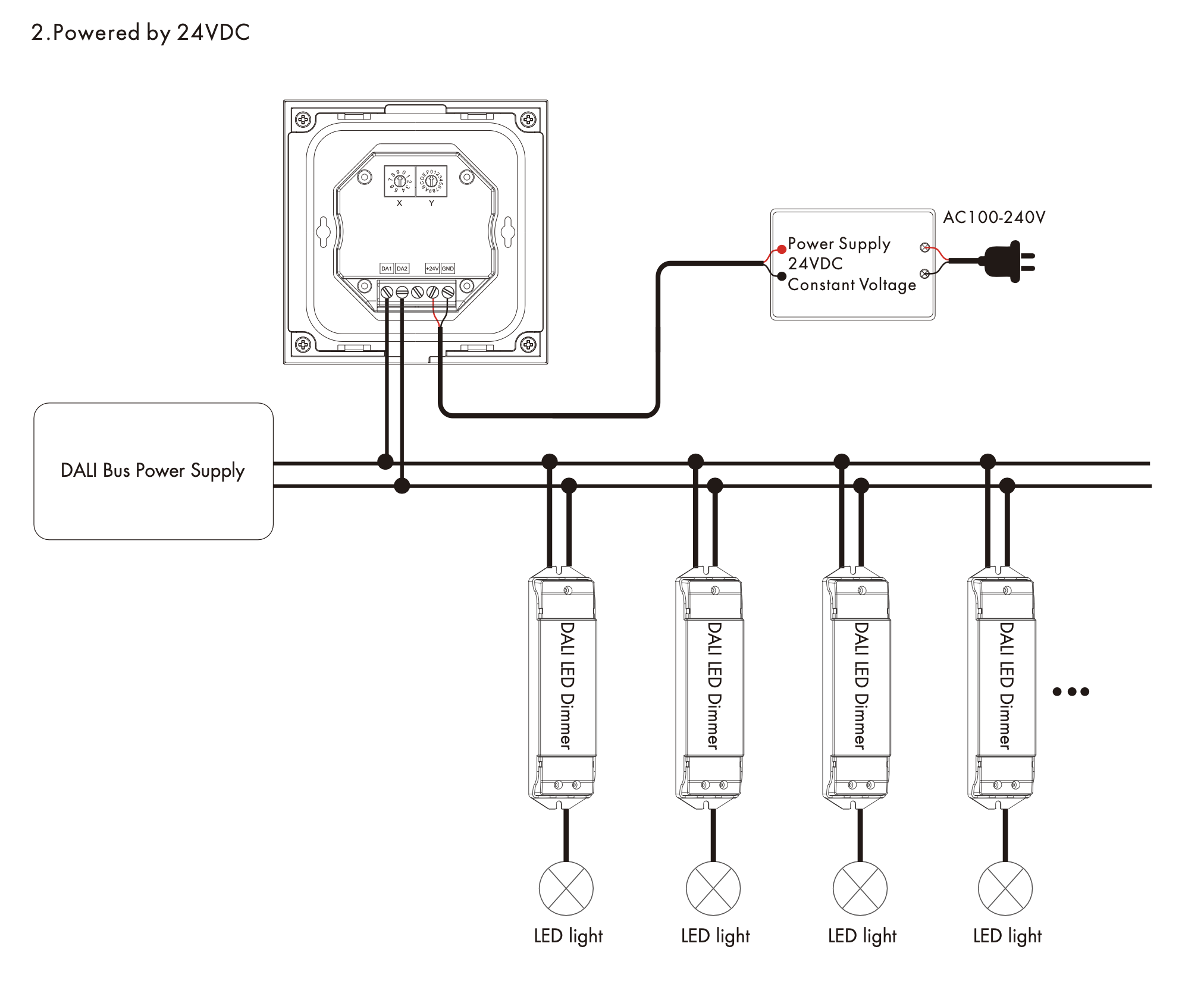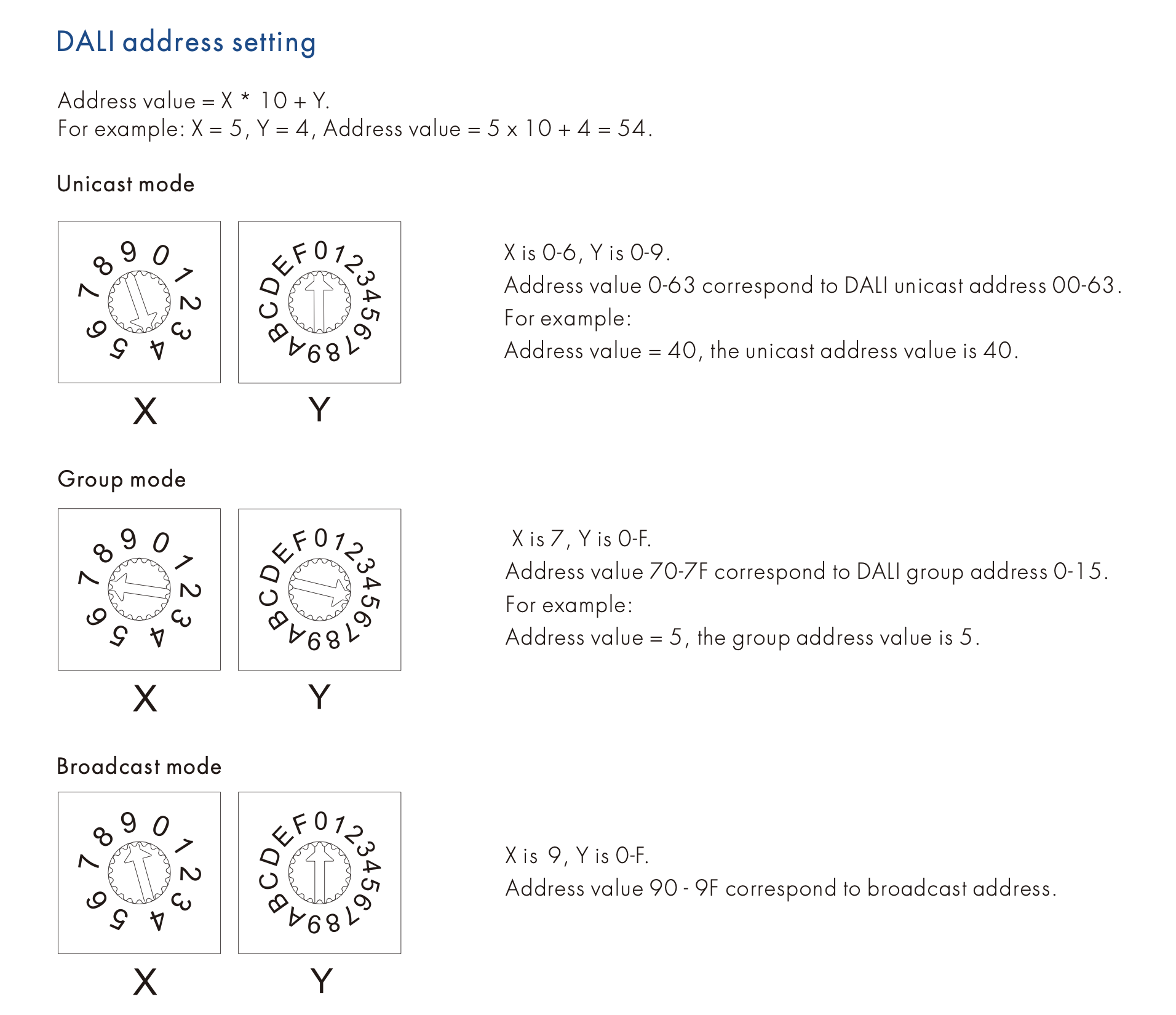 - Możliwość wyboru adresu DALI za pomocą przełącznika kodowania, obsługuje tryb unicast, grupowy i broadcastowy