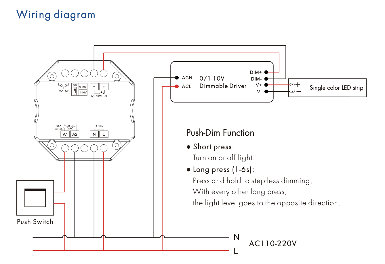 - Podłączenie zewnętrznego przełącznika push switch do włączania/wyłączania oraz ściemniania w zakresie 0-100%.