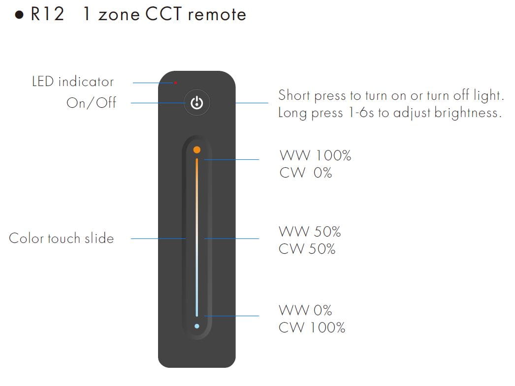 Pilot RF R12(B) służy do sterowania oświetleniem LED o zmiennej temperaturze barwowej (taśma LED CCT lub dwie taśmy LED ciepłej i zimnej barwy)